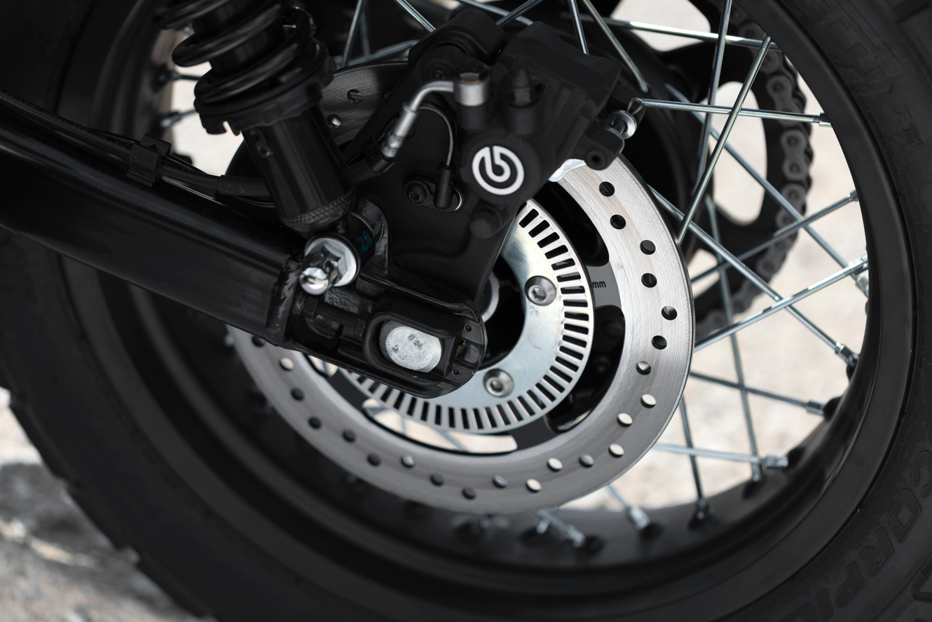 Front Single 320mm floating disc, Brembo twin-piston floating calliper, ABS